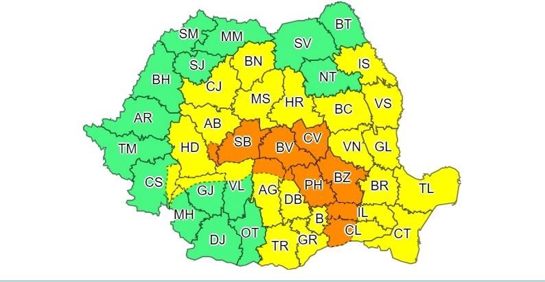 Vineri, de la ora 12.00 până sâmbătă, la ora 10.00, codul galben va fi activ în Transilvania, Muntenia, Dobrogea, mare parte din Moldova și zona montană. În aceste regiuni, instabilitatea atmosferică va fi accentuată și vor fi averse torențiale, descărcări electrice, intensificări de scurtă durată ale vântului (viteze în general de 55...65 km/h), vijelii și grindină. Pe arii restrânse, cantitățile de apă vor fi de peste 40 l/mp.