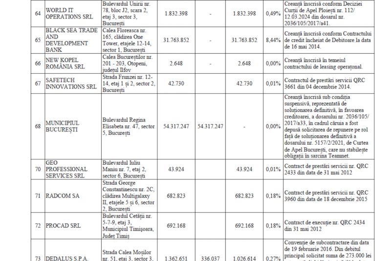 Pe rând, Ghiță datorează bani pentru companiile ASESOFT INTERNATIONAL SA în cuantum de peste 206.200.000 lei, TEAMNET INTERNATIONAL SA în cuantum de peste 442.400.000 lei, INFRATEL NET SRL, în cuantum de peste 17.900.000 lei, 2K TELECOM SRL în cuantum de 395.472.034 lei, TVMP SRL, în cuantum de peste 660.000 lei.